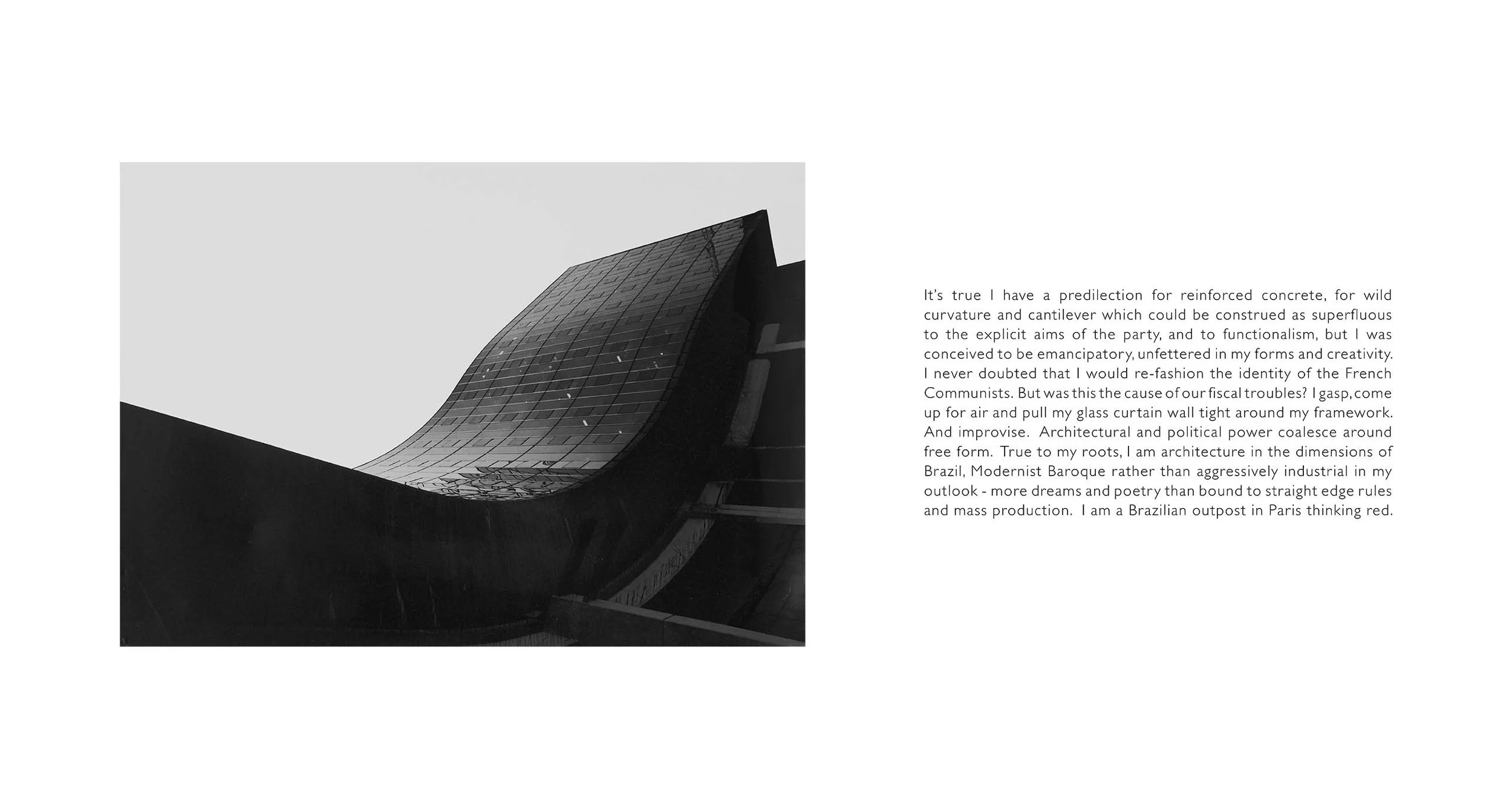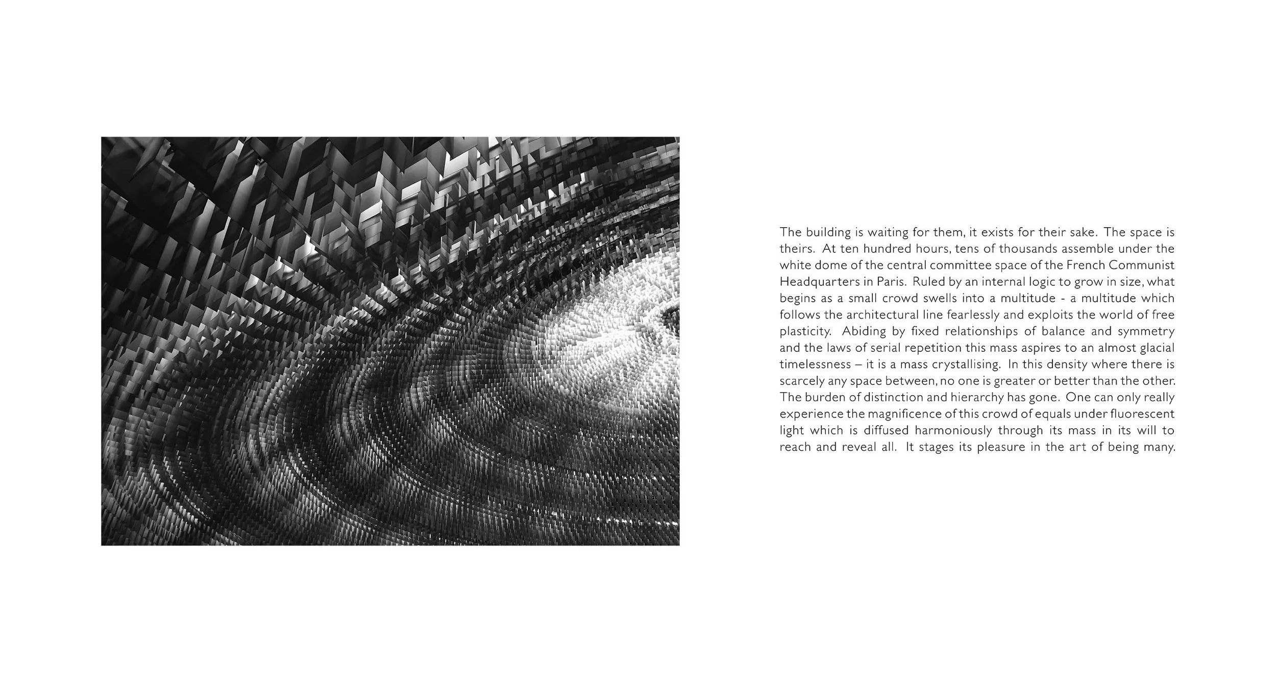 The narrative in these works has been constructed not so unlike this building would have been - its parts cast, selected, arranged and assembled into a whole. Narrative is inscribed in the PCF’s sequences of spaces. Every day the headquarters performs a spatial narrative. Even before you have crossed the threshold from outside to inside you have already entered a world that blends reality with fiction. These short narratives combine images and text to reveal the kind of encounter the building and its spatial forms might incite; a sudden mass gathering of glacial proportions and timelessness or the promise of sleep offered by a space in quiet recline. Here form is never mere form but has a dynamic of its own. Spatial liberation and play between bodies, both human and non-human characterise these narratives to reveal hidden or suppressed desires and longings like the one for collectivity.